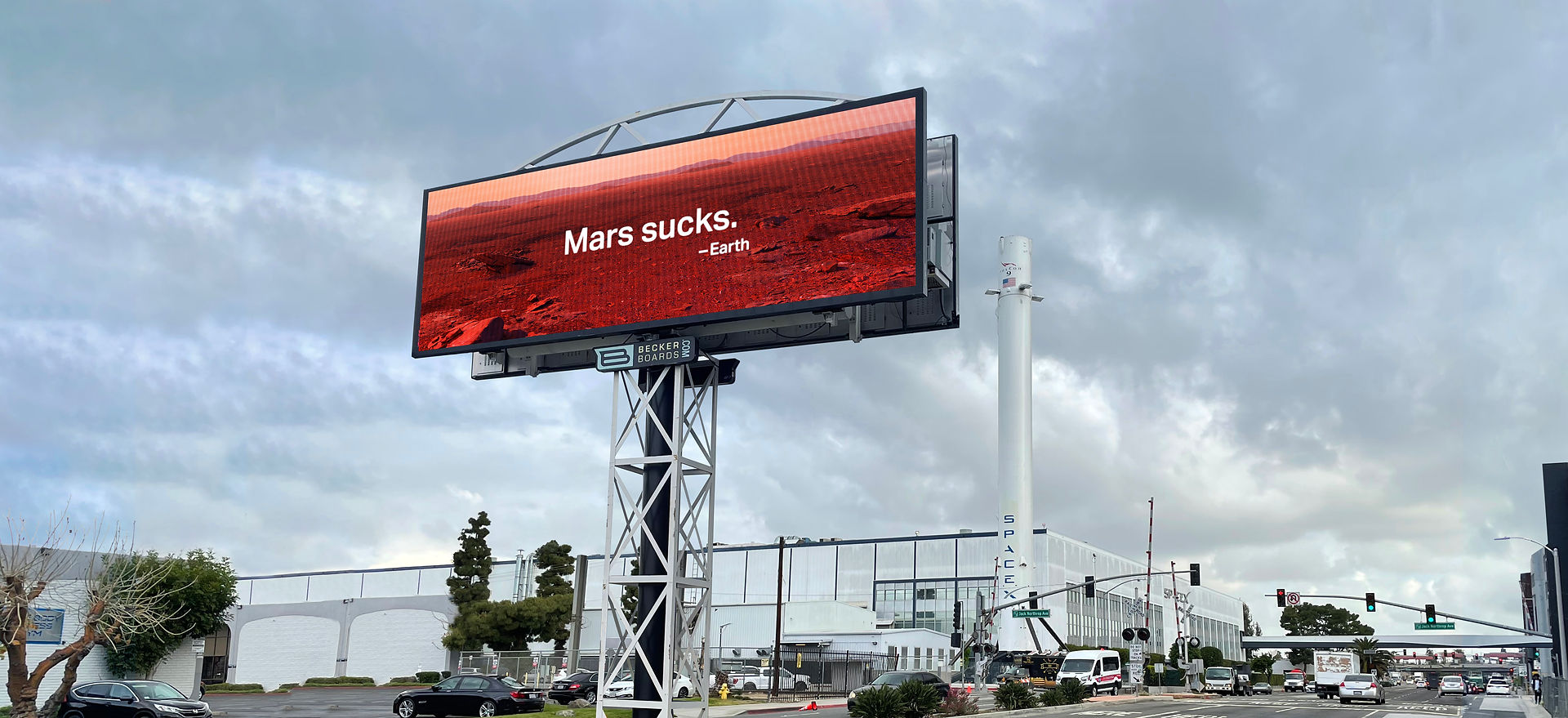 On Earth Day, we refocused the attention back from Mars to Earth. By placing a message directly in front of SpaceX headquarters reminding everyone who would rather try to escape this planet for another one… Mars Sucks. - Earth